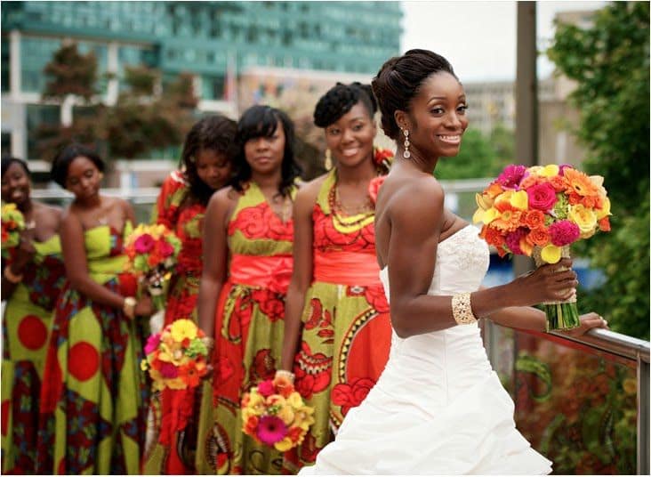 Em países da África Ocidental, como a Nigéria e Gana, vestidos de noiva costumam ser coloridos, com tecidos típicos e estampas que carregam identidade cultural e familiar.